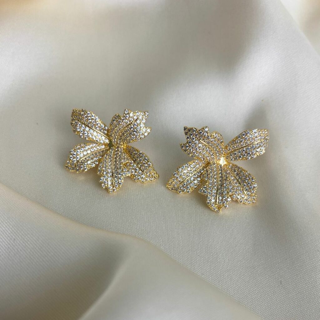 Um verdadeiro espetáculo em forma de semi joia! Esse brinco banhado a ouro é uma obra de arte com design inspirado em pétalas em movimento, todo cravejado com zircônias transparentes que captam a luz de forma encantadora. Delicado, mas com presença marcante, ele une elegância e exuberância em uma única peça, perfeito para quem ama acessórios que chamam atenção sem perder a leveza.