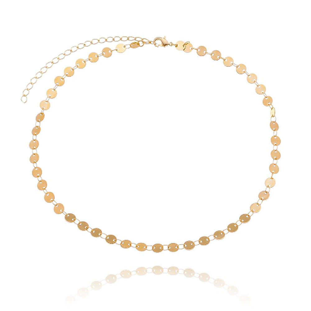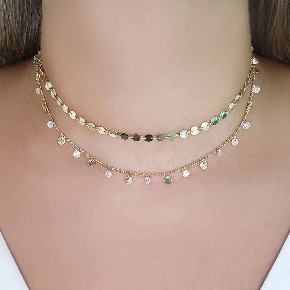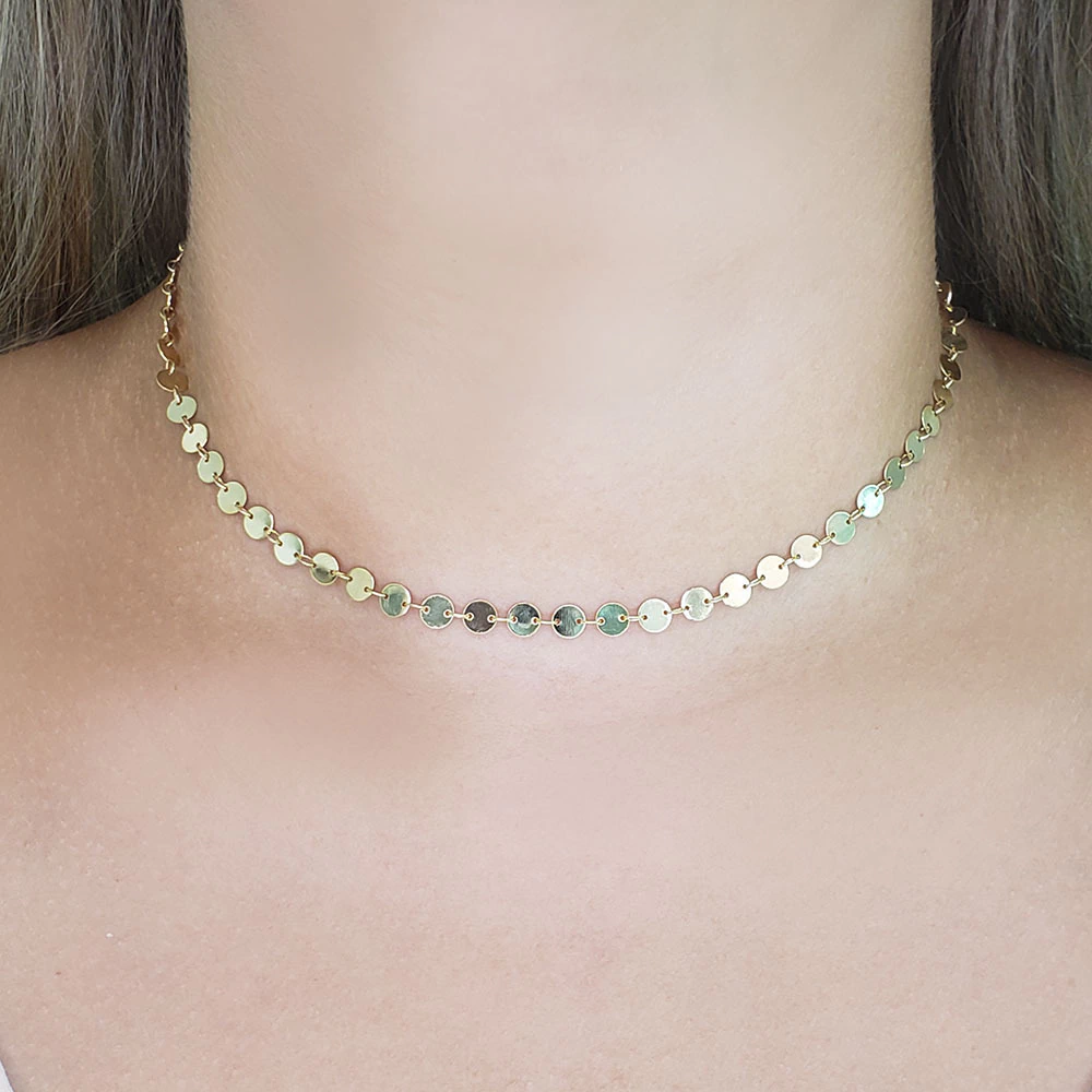 Uma delicadeza esse colar Choker banhado em ouro amarelo 18k, com plaquinhas redondas unidas por meio de pequenos elos. Perfeito para fazer composições com outros colares.