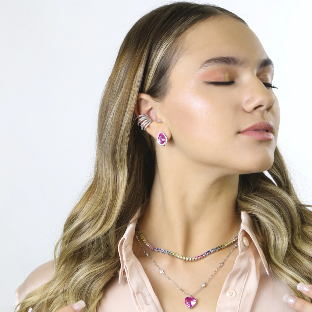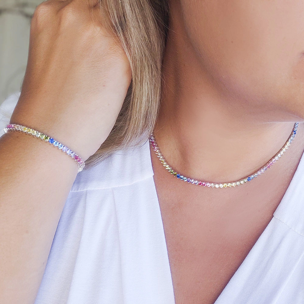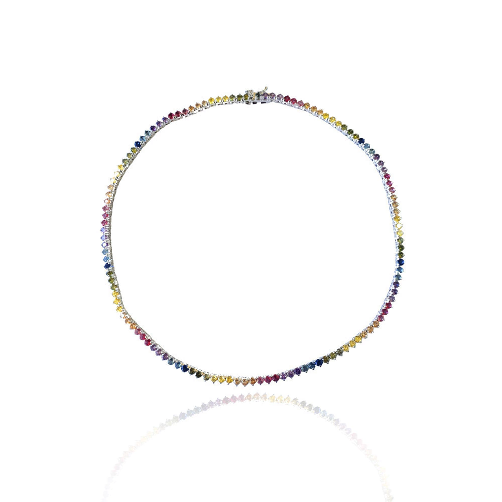 Belíssimo colar modelo riviera maleável com zircônias coloridas, cravejado com três garras e banhado em ródio branco e fecho gaveta.