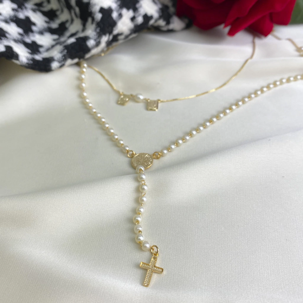 Um acessório que une fé, estilo e sofisticação. Este colar tipo terço é composto por delicadas pérolas e acabamento em banho de ouro, trazendo elegância e significado em cada detalhe. A medalha central e a cruz pendente adicionam um toque especial de devoção, ideal para quem busca um acessório cheio de simbologia e beleza.
