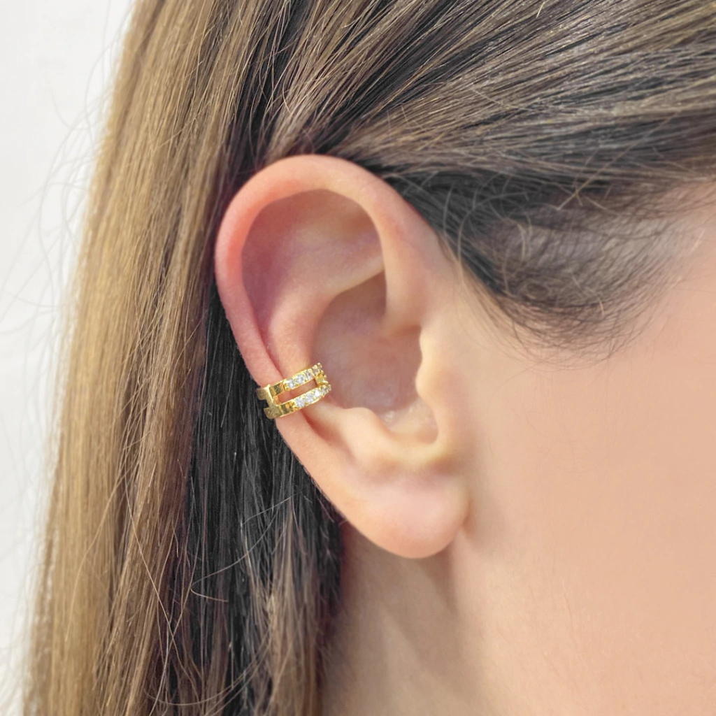 Lindo Piercing de Pressão em formato de U com zircônias transparentes banhado em ouro 18k. Garante o diferencial em produções.