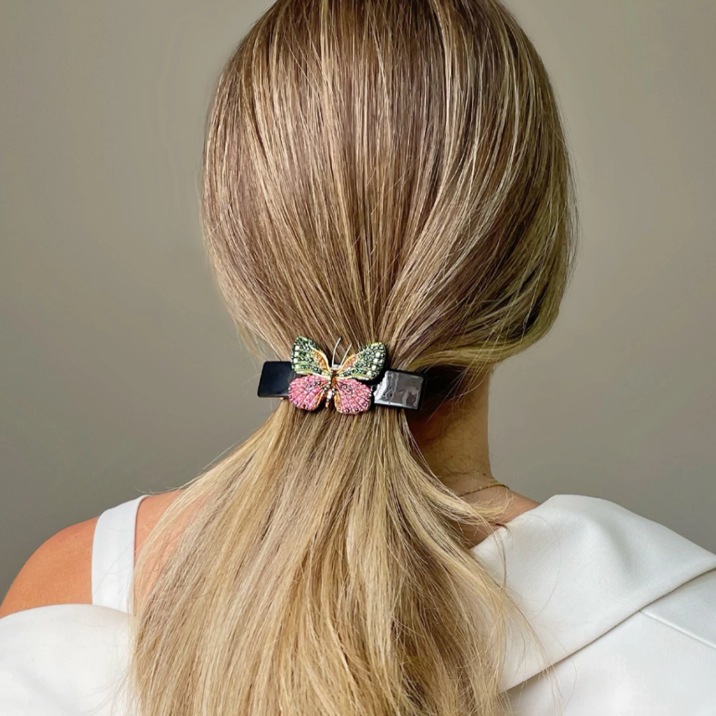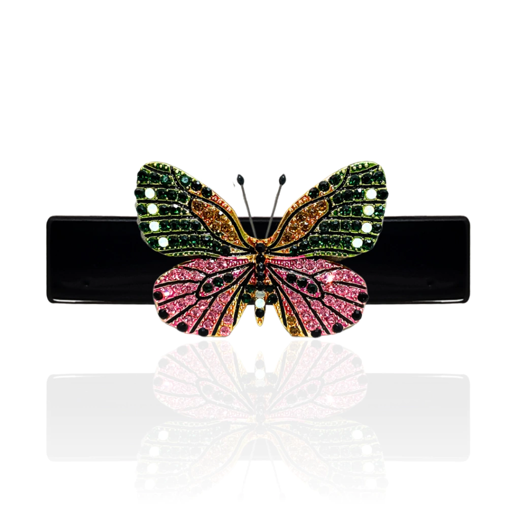 Presilha chique e elegante de acetato mesclado, com borboleta toda cravejada com mini cristais em tons de pink, verde, uma delicadeza! A parte de prender da peça tem ótima resistência e o acabamento é todo emborrachado para evitar que o acessório de cabelo escorregue dos fios.