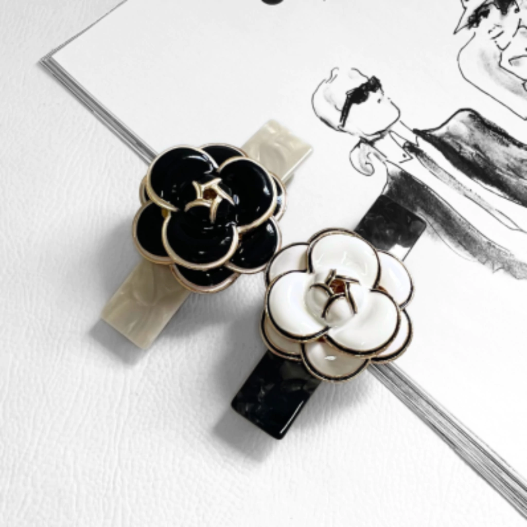 Inspirada na flor preferida de Gabrielle, a Camélia é elegante e delicada em sua versão de metal esmaltada aplicada em presilhas com base de acetato. Detalhe especial: o acabamento das camélias é feito com a cor contraste e um filete de esmalte dourado. Fica perfeita para prender os cabelos!