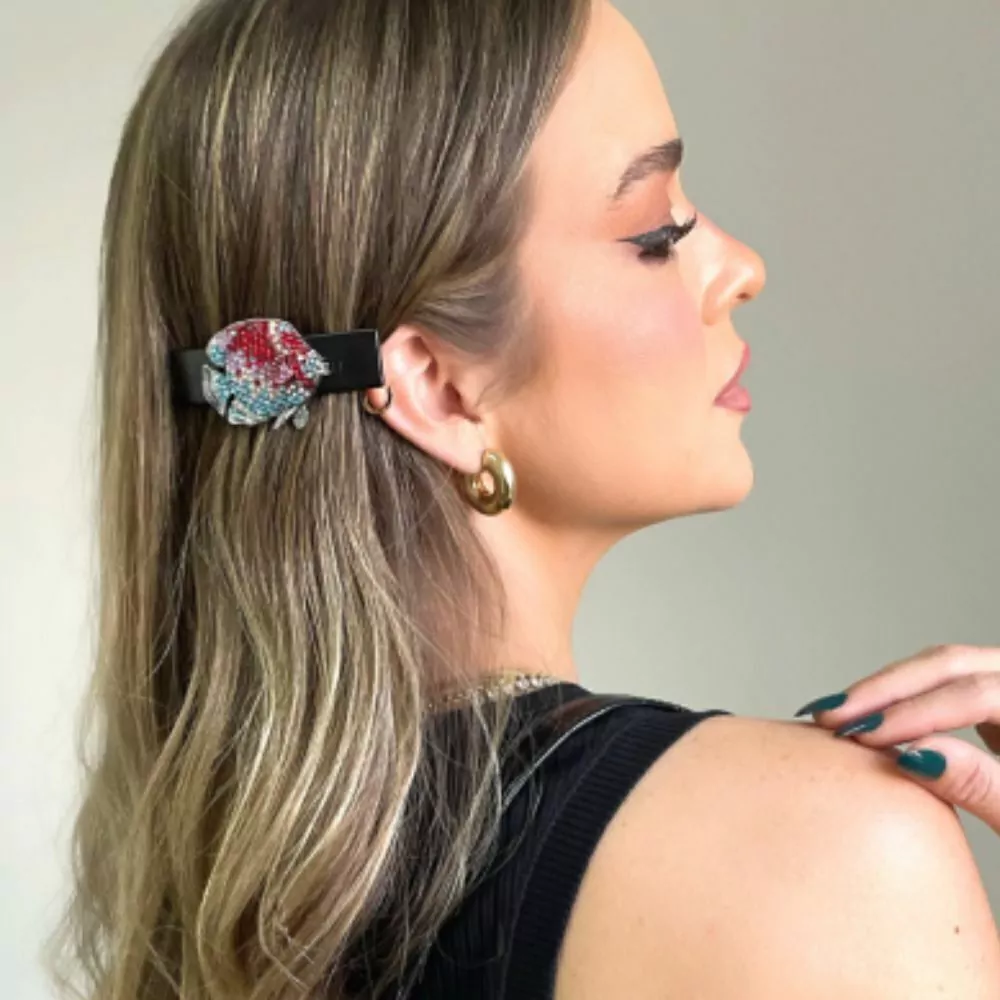 Maravilhosa Presilha de acetato mesclado em formato de peixe todo cravejado com mini cristais na cor predominante Azul e vermelho. A máquina de prender da peça tem ótima resistência e o acabamento é todo emborrachado para evitar que o acessório de cabelo escorregue dos fios.